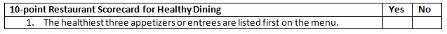 Here are three of the ten questions on the scorecard that rate the healthfulness of the restaurant. The more �yes� answers, the higher the rating, and the kinder the restaurant is to your waist: